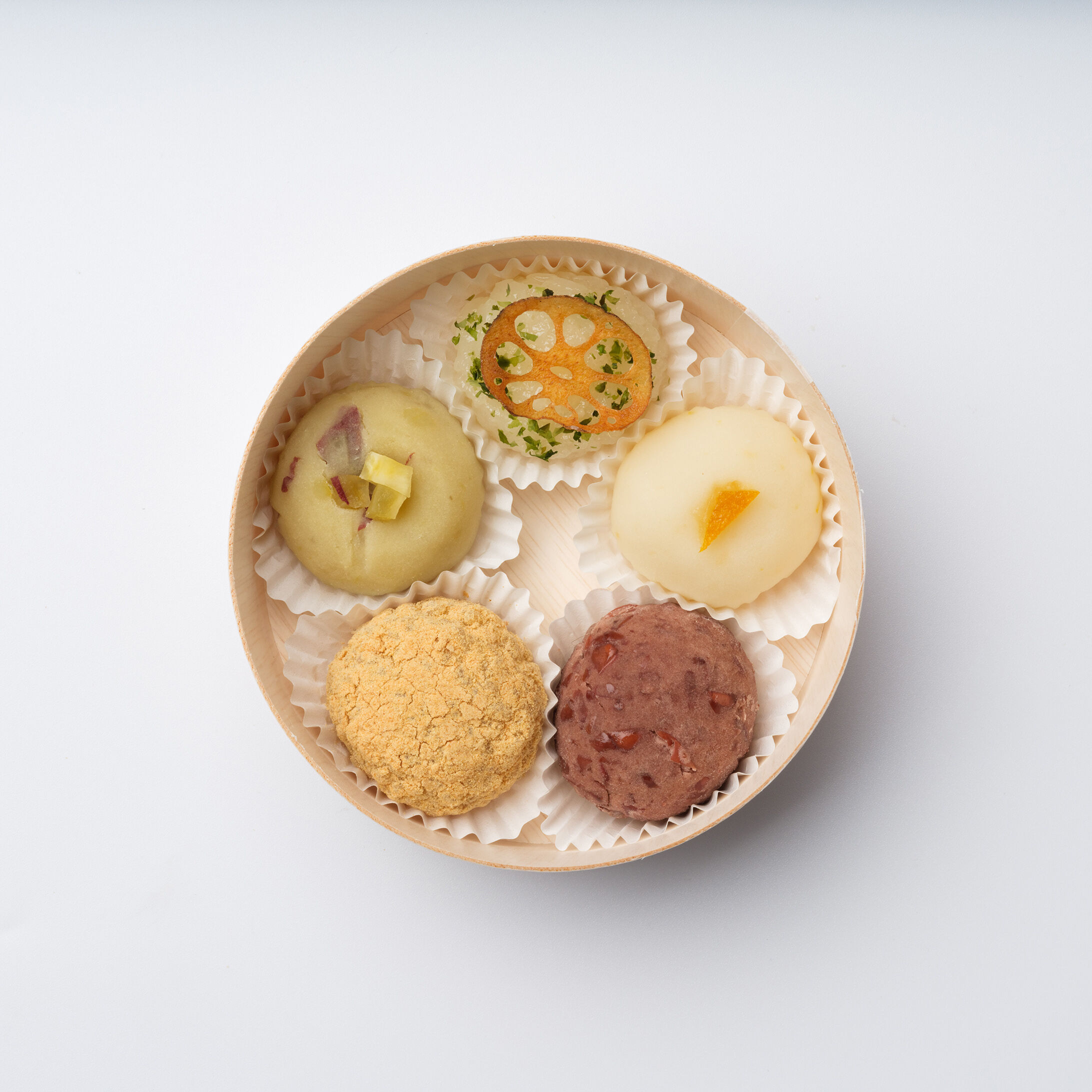 「七福おはぎ」は、曲げわっぱの箱に、七つの福をテーマにした華やかなミニおはぎを詰めています。