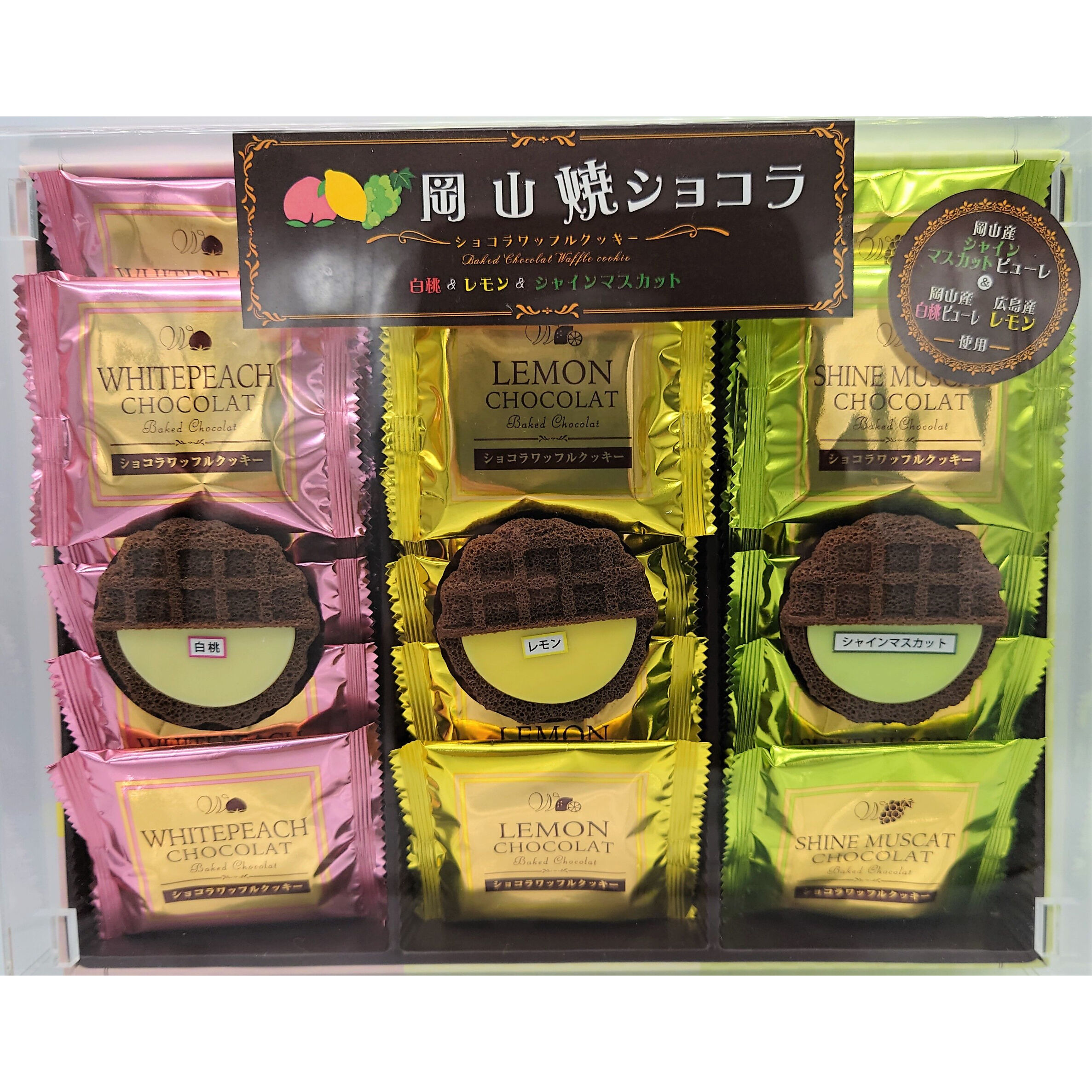 株式会社タナベの「岡山3種焼ショコラ」は、岡山と広島県産の果物を使ったユニークなショコラワッフルクッキーです。このセットには白桃、レモン、シャインマスカットの3種類の味が含まれています。