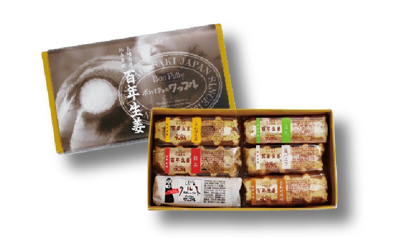 クルスの「百年生姜ワッフル」は、長崎県島原半島の歴史ある生姜農家、松本農園の生姜を使用したワッフルです。このワッフルには、クルス(ホワイトチョコ)、豆乳、しあわせ生姜、紅茶、塩バニラ、合わせ味噌の6種類の味があり、それぞれに生姜が加えられています。
