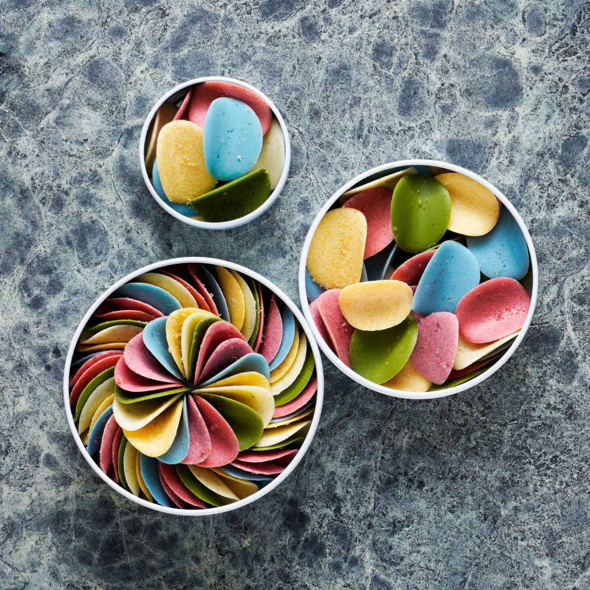 人工着色料を使わず、素材本来の優しい色合いでお作りしております、独自の特許製法によって本物の花びらのように一時的に仕上げられたチョコレートは、パリっとした食感と優しい口どけに仕上がりました。