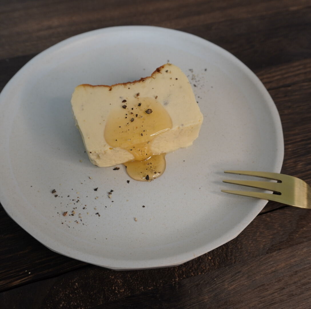 低温湯煎焼きにより、口の中でとろけるような滑らかな食感と、ブルーチーズ特有の風味が絶妙にマッチしています。塩味が効いた大人向けの味わいで、はちみつや黒胡椒を加えることでさらに味のバリエーションを楽しめます。また、日本酒やワインなどお酒とのペアリングもお楽しみいただける、味わい深いチーズケーキです。